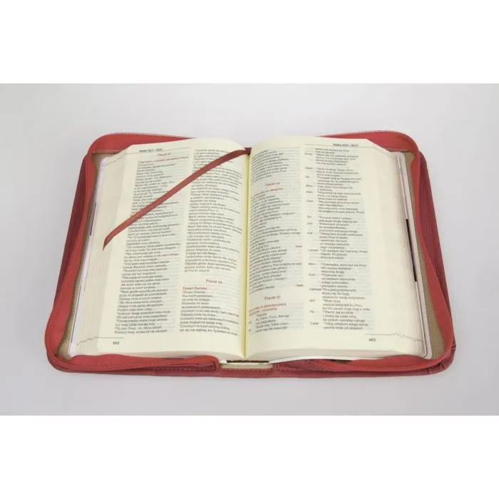 Biblia została wydana w praktycznej, malinowej oprawie z suwakiem i tasiemką. Zdobienia na okładce nadają jej elegancki i estetyczny wygląd, a solidne wykonanie zapewnia trwałość przez lata.